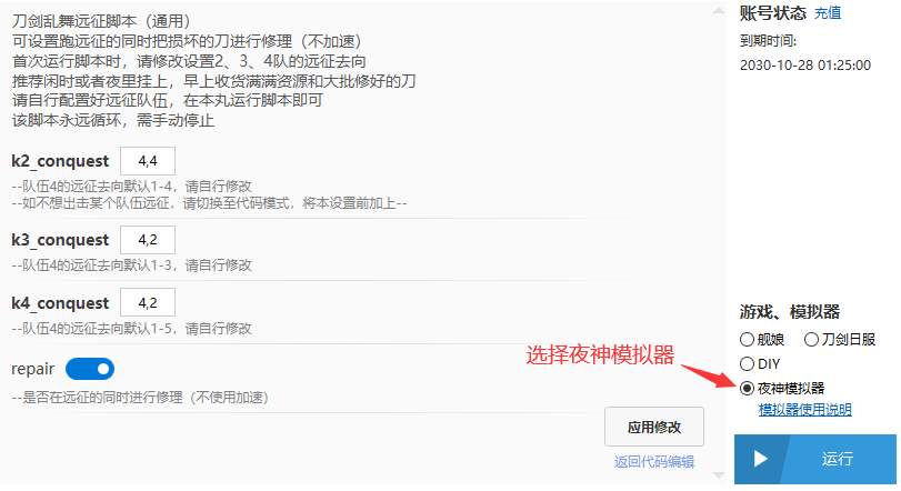 中间区域是脚本设置内容,你可以自行调整参数或点击返回代码编辑修改设置。