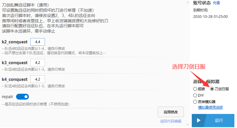 修改设置后点击【应用修改】,右侧选择【刀剑日服】