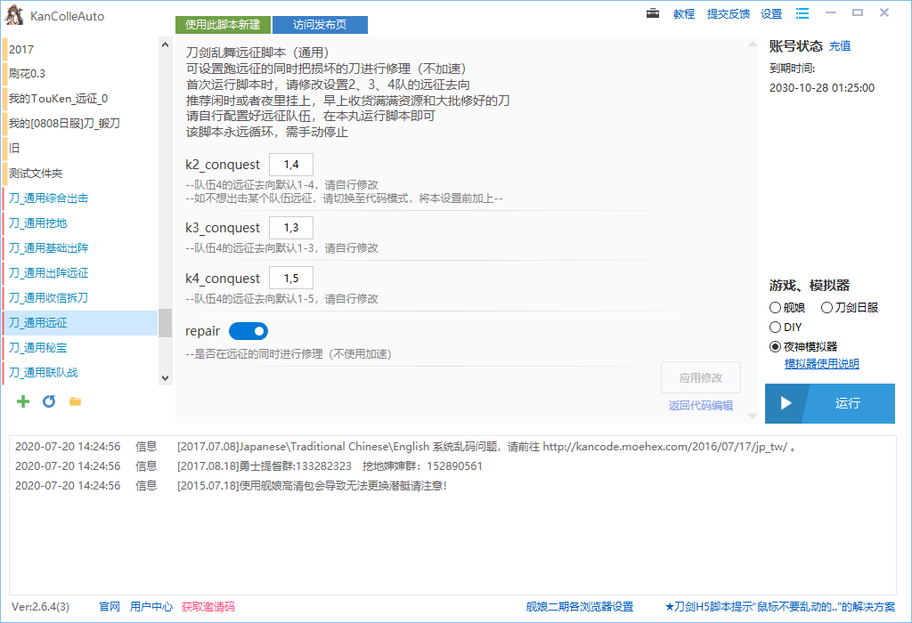 左边是脚本列表,带有红色标志的为KCA自带脚本。